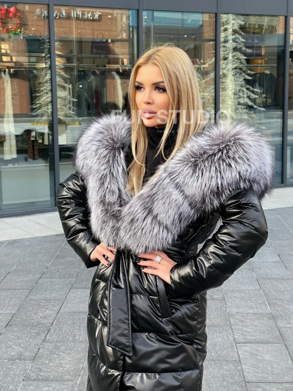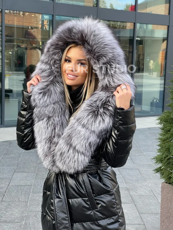 Чёрное пуховое пальто с меховым капюшоном 100223