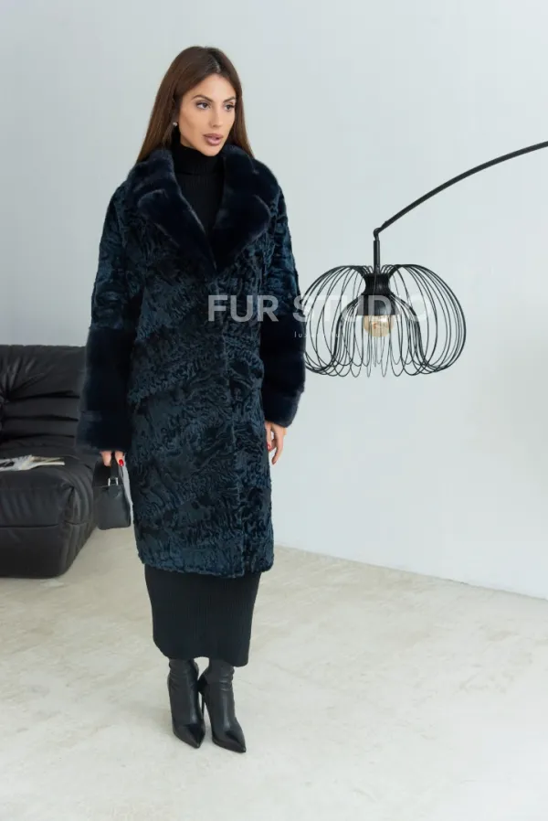 Шуба из каракульчи с английским воротником норки - цвет темно-синий 100188