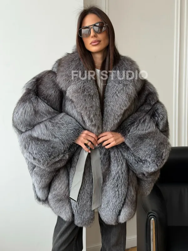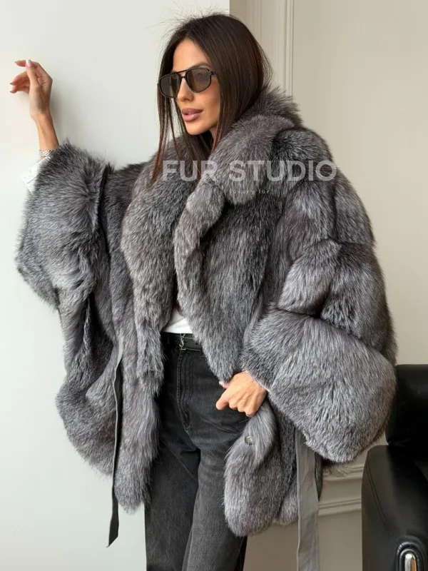 Мех данной шубы лиса, цвет серый. Предлагается в размерах от 42 до 52 (oversize). Длина модели 75-80 см, что выгодно подчеркивает фигуру девушек. Эта модель идеально подойдет для девушек и женщин, предпочитающих роскошные натуральные меха.